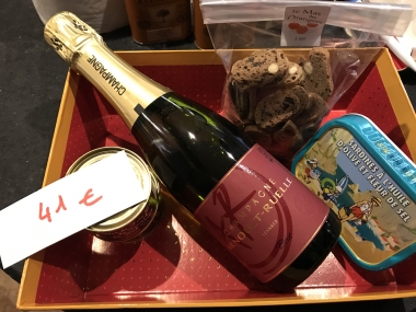 Panier composé de produits français et pour la plupart locaux. Bouteille de Champagne 50cl Bloc de Foie gras de canard 70gr Délice Périgourdin avec 25% de foie gras de canard Croquets aux olives ou fromage) Boite de sardines à la fleur de sel »» Ajouter au Panier «« |